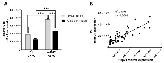 KRIBB11 effect on mEHT-induced C4b production. C4b mRNA relative expression, 2 h post-mEHT, normalized to 18S, with KRIBB11 treatment, vs. DMSO (A). Correlation between C4b and Hsp70 expression (B). Mean ± SEM, Two-way ANOVA, n = 5–15/group, *: p < 0.05, ***: p < 0.001, ****: p < 0.0001. Cell line: 4T1.