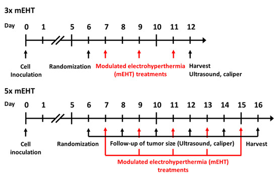 Tumors were treated 3–5 times with the newly developed rodent modulated electro hyperthermia device as described in detail in our previous paper [1]. The principle of the treatment is a capacitively coupled, amplitude-modulated, 13.56 MHz electromagnetic field which transfers energy to the tumors. The electromagnetic field was established between two electrodes in the inguinal region. The mobile (upper) electrode was a 2 mm diameter column-shaped plastic case filled with stainless steel rods, covered with 3.1 cm2 silver-plated textile, positioned on the tumor. Animals were placed on a heating pad (in vivo applicator), functioning as the lower electrode, and connected to the LabEHY modulated electro hyperthermia 200 device with heating and radiofrequency (RF) cable. The abdominal area below the mobile electrode and the back of the mice was shaved before the treatments to enable electric coupling. Treatments were performed with a LabEHY 200 device in a temperature-driven way, for 30 min with 0.7 ± 0.3 watts after a 5-min-long warmup. Temperature monitoring was performed with a four-channel TM-200 thermometer (Oncotherm Ltd., Budaörs, Hungary). Temperature sensors were placed (1) on the skin above tumor, (2) in the rectum for core temperature monitoring, (3) on the heating pad and (4) nearby the treatment setup for room temperature monitoring. Skin temperature was kept at 40 ± 0.5 °C during the treatments, as it assured the required 42 °C inside the tumor. Rectal temperature was kept in the physiologic range (37.5 ± 0.5 °C), and the lower electrode’s temperature was set at the same temperature. Room temperature was at 25 ± 1 °C. During sham treatments, the electromagnetic field was turned off but all other conditions (heat pad temperature, upper electrode position) were similar to the mEHT treatment. A schematic illustration of the treatment procedure is presented in Figure 9. Numbers of animals in the three-time treatment experiments were nsham = 7, nMeht = 18, and nsham = 9, nmEHT = 7 in the five-time treatment experiment.