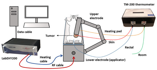 Schematic illustration of mEHT treatment setup. Mice were placed on the lower electrode (in vivo applicator) in isoflurane anesthesia. The upper electrode was positioned on the tumor in the inguinal region. The LabEHY200 was connected with the lower electrode with a radiofrequency (RF) and a heating cable. Temperature monitoring of tumor surface (red: skin temp. sensor), rectum (blue), heating pad (yellow) and room temperature (green) was performed by a TM-200 thermometer and the data were registered with a computer during the treatment.