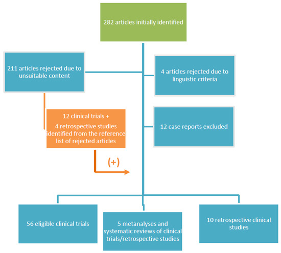 Diagram summarizing the elimination process of the initially identified published papers. There were 4 articles not written in English, 12 case reports and 211 articles with unsuitable content were excluded. Then, 16 eligible articles were recovered from the reference lists of the retrieved articles. Then, 56 clinical trials, 5 metanalyses and systematic reviews and 10 retrospective clinical studies were eventually included in the present review.