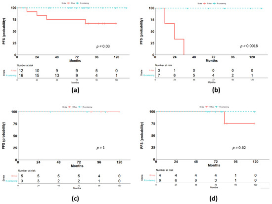 Outcome according to the treatment protocol. (a) Comparison of progression-free survival (PFS) for the two treatment groups, Rituximab-containing (R-containing) and Rituximab-free (R-free); (b) comparison of PFS for advanced-stages; (c) comparison of PFS for early unfavorable stages; (d) comparison of PFS for early favorable stages.