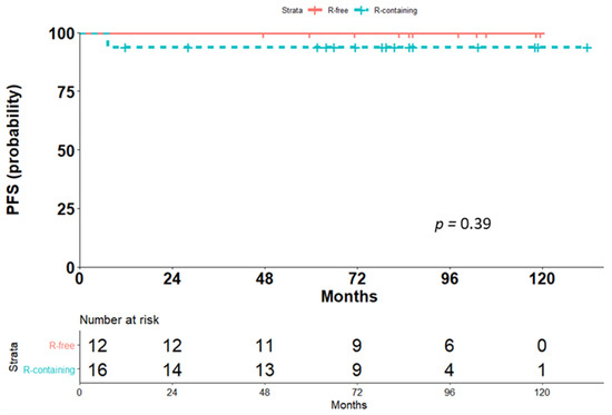 The OS was similar for the two treatment groups, with only one event in the Rituximab-containing group (p = 0.39, Figure 2). This patient had documented CR at the one-month assessment after the last dose of scheduled immunochemotherapy but died due to bleomycin-induced pneumonitis.