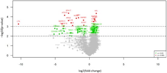 Basic quality control of run data was performed by mean-vs-variances plotting to find outliers in target or sample level. True differences were calculated by correlation matrices analysis. Pathway analysis is based on the KEGG database and was performed using the “pathview” package of R. Differences were specified by −log2 fold changes between means (if parametric) or medians (if non-parametric) of compared groups. Significant pathway associations were identified by gene set enrichment analysis using the WEB-based GEne SeT AnaLysis Toolkit (WebGestalt) [43,44,45]. Each run was executed with 1000 permutations. Finally, all associations were ranked according to the false discovery rate (p < 0.05).