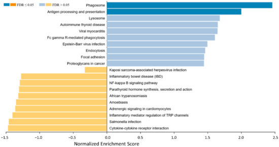 In the SMM mainly the pathways for phagosome, antigen processing and presentation, lysosome, autoimmune thyroid disease, viral myocarditis, Fc gamma R-mediated phagocytosis, Eppstein–Barr virus infection, endocytosis, focal adhesion, and proteoglycans in cancer show the strongest enrichment. On the other hand, cytokine–cytokine receptor interaction, salmonella infection, inflammatory mediator regulation of TRP channels, adrenergic signaling in cardiomyocytes, amoebiasis, African trypanosomiasis, parathyroid hormone synthesis, secretion and action, NF-kappa B signaling pathway, inflammatory bowel disease, and Kaposi sarcoma-associated herpesvirus infection are identified as enriched and thereby potentially activated in EMM.