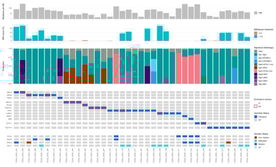 One of two cases that harbored germline inactivating NTHL1 variant (p.Gln90*) had evidence of tumor variant enrichment (Figure 1). This case showed high TMB and presence of Signature 30, characterized by the prevalence of C>T mutations and associated with deficiency in base excision repair expected due to NTHL1 inactivation []. However, this case also showed high MSI and MLH1 methylation. Finally, no cases with the germline pathogenic MUTYH variant (c.1187G>A, p.Gly396Asp) showed evidence of variant enrichment in the tumor nor presence of Signature 18, associated with MUTYH inactivation. Of note, while three cases with MUTYH variants had high TMB, we attributed it to MMR deficiency in the tumor due to MLH1 methylation or deletion of MSH2, supported by high MSI levels and MMR-deficient mutational signatures.