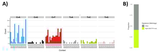 - Viel, A.; Bruselles, A.; Meccia, E.; Fornasarig, M.; Quaia, M.; Canzonieri, V.; Policicchio, E.; Urso, E.D.; Agostini, M.; Genuardi, M. A Specific Mutational Signature Associated with DNA 8-Oxoguanine Persistence in MUTYH-Defective Colo-Rectal Cancer. EBioMedicine 2017, 20, 39–49. [Google Scholar] [CrossRef]