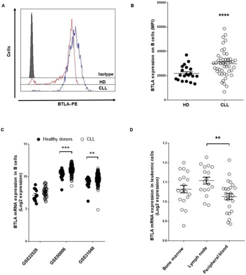 BTLA immune checkpoint expression is upregulated on leukemic cells from patients with CLL. BTLA surface expression on leukemic cells from patients with CLL (n = 46) and B cells from HD (n = 20) was evaluated by flow cytometry. (A) Representative histogram of BTLA expression (MFI) in HD and patients. (B) Comparison of BTLA levels between leukemic cells from patients and B cells from controls (MFI ± SEM). (C) Three available microarray data from the GEO database were interrogated to analyze BTLA mRNA expression in leukemic cells from patients with CLL in comparison with HD. (D) BTLA mRNA levels were evaluated according to leukemic cell localization (GSE21029). Each dot represents an individual sample. ** p < 0.01, *** p < 0.001 and **** p < 0.0001.