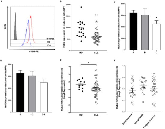 HVEM surface expression is decreased on leukemic cells from patients with CLL. HVEM expression was evaluated on leukemic cells from patients with CLL (n = 46) and B cells from HD (n = 20) by flow cytometry. Representative histogram (A) and comparison (B) of HVEM expression on leukemic and B cells from patients with CLL and controls (MFI ± SEM) are shown. Comparison of HVEM surface expression in patients stratified by Rai stage (C) and Binet stage (D) (MFI ± SEM) are depicted. (E) Microarray data from the GEO database were employed to determine HVEM mRNA expression in patients with CLL regarding HD (GSE22529). (F) HVEM mRNA levels were evaluated according to leukemic cell localization (GSE21029). * p < 0.05, ** p < 0.01.