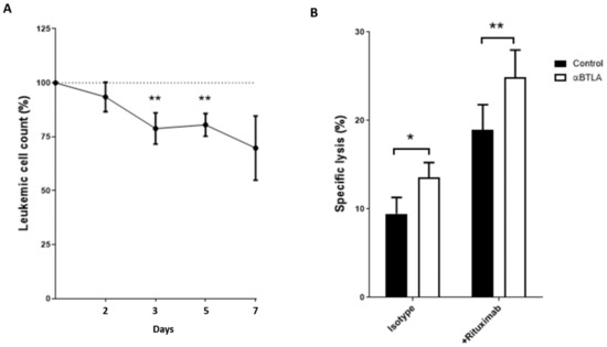 BTLA blockade depletes leukemic cells and increases NK cell-mediated cytotoxicity. (A) PBMCs from patients with CLL were treated with blocking anti-BTLA mAb or control IgG (10 µg/mL) and absolute leukemic cell count was evaluated at indicated timepoints. (B) The effect of BTLA blockade on NK cell-mediated cytotoxicity was evaluated by calcein-AM assay. PBMCs from patients were treated with blocking anti-BTLA mAb or control IgG (10 µg/mL) (n = 11) for 72 h and then co-cultured with MEC-1 cell line (pre-treated with 10 µg/mL of rituximab or control IgG for 30 min) at 25:1 (effector: target) ratio for 4h. * p < 0.05, ** p < 0.01.