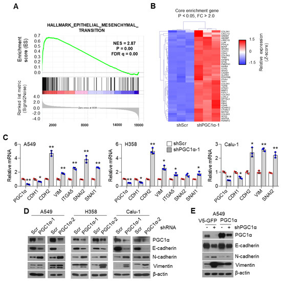 PGC1α loss promotes the epithelial–mesenchymal transition (EMT) in lung cancer cells. (A,B) Plot and heat map for the top gene set and core enrichment genes of the gene set enrichment analysis (GSEA) in A549 cells. (C) Expression of the EMT genes quantified by qPCR. (D) Western blots of the three EMT proteins and PGC1α in the control and PGC1α-silenced cells. (E) Western blots of indicated proteins in cells expressing GFP (pLX304-V5-GFP) or PGC1α (pLX304-V5-PGC1α) in the control and PGC1α knocked-down A549 cells. (F) qPCR of EMT genes. Values represent mean ± SD (n = 3). * p < 0.05 and ** p < 0.01 by Student’s t-test. The whole western blot images are showed in Figure S7.