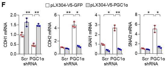 To unravel the role of PGC1α in lung cancer, we first selected the ideal lung cancer cell lines, which showed either high or low levels of PGC1α, and we found that PGC1α levels are downregulated in lung cancer cells compared to Beas-2b, normal bronchial epithelial cells (Figure S1A,B). Short Tandem Repeat (STR) analysis was carried out to validate the lung cancer cell lines used in this study (Table S1). Because PGC1α levels in A549 cells were much higher than other lung cancer cell lines, we then analyzed the transcriptome to investigate the functional role of altered PGC1α expression in A549 lung cancer cells. An increased EMT gene expression signature was observed in PGC1α-silenced A549 cells (Figure 1A). We also compared the core enriched genes in the EMT gene set and found previously known EMT genes (Figure 1B and Figure S1C). Consistently, the suppression of PGC1α significantly decreased the expression of CDH1, an epithelial marker, whereas it increased the expression of CDH2, VIM, ITGA5, SNAI1, and SNAI2, which are the mesenchymal markers (Figure 1C). The alteration of EMT genes’ expression in PGC1α knocked-down lung cancer cells translated into changes in protein levels (Figure 1D). In addition, the restoration of PGC1α abolished the alteration of EMT genes and the expression of the corresponding proteins in PGC1α knocked-down A549 cells (Figure 1E,F). Collectively, these results support the speculation that the loss of PGC1α is required for EMT in lung cancer.