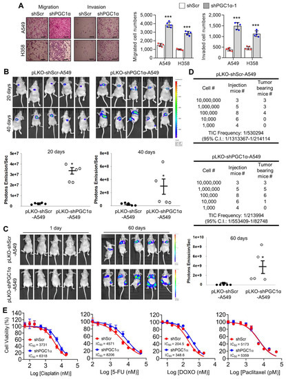PGC1α loss promotes tumor initiation and lung cancer metastasis to bone. (A) Migrated and invaded cells in control and PGC1α-silenced A549 and H358 cells (n = 5). Scale bar represents 200 μm. High Resolution Images are showed in Figure S8. (B,C) Luciferase images from control or PGC1α-silenced A549 cells xenografted mice (n = 5) by intratracheal (B) and tail-vein (C) injection. Luciferase images represent one picture captured and the values of photons emission are represented as mean ± SEM of the indicated number of mice. * p < 0.05 by Student’s t-test. (D) In the serial dilution xenograft assays, a varying number (as indicated) of the control or PGC1α knocked-down A549 cells were transplanted in BALB/c-nude mice by subcutaneous (S.C.) injection and incubated for 4 weeks. (E) Cell viability analysis after the control or the PGC1α-silenced A549 cells were treated with cisplatin, 5-fluoruracil (5-FU), doxorubicin, and paclitaxel at different concentrations, as indicated, for 3 days. Values represent mean ± SD (n = 3). * p < 0.05 and *** p < 0.001 by Student’s t-test.