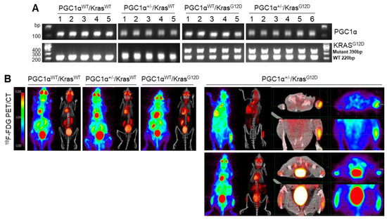 Mice in this study were assigned to four different groups and age-matched. Group 1 is PGC1αWT; KrasWT. Group 2 is PGC1α+/−; KrasWT. Group 3 is PGC1αWT; KrasG12D. Group 4 is PGC1α+/−; KrasG12D. PET/CT scanning was performed after mice were fasted for 12 h but had free access to water. Mice were anesthetized using vaporized isoflurane (4% for induction; 2.5% for maintenance). Sterile normal saline (0.1 mL) was injected subcutaneously to ensure adequate hydration. PET/CT scanners (Biograph LOS; Siemens Healthcare, Erlangen, Germany and Discovery LS; GE Healthcare, Milwaukee, WI, USA). Non-contrast CT images were acquired in the range of the skull base to upper thigh, and subsequent PET images were acquired 60 min after lateral tail vein injection of 18F-FDG (8.65 ± 2.7 MBq). The standardized uptake value (SUV) was calculated as (decay-corrected activity [kBq] per milliliter of tissue volume)/body mass [g]). The SUVs of lesions were obtained by manually placing of a volume of interested (VOI) around the lesion. Acquisition of dynamic spiral CT imaging was performed using a multidetector CT scanner (Lightspeed pro-16, GE Healthcare) with contrast enhancement.