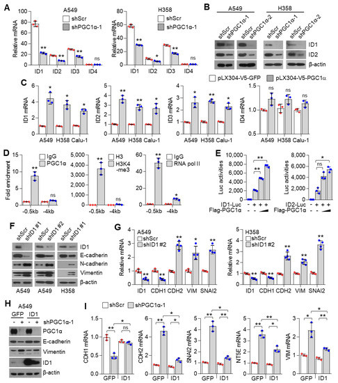 ID1 is a downstream target of PGC1α and is linked to EMT in lung cancer cells. (A) qPCR of ID genes in the control or PGC1α-silenced A549 and H358 cells (n = 3). (B) Protein expression of ID1 and ID2 in the control and PGC1α-silenced A549 and H358 cells. (C) Expression of the ID genes in GFP or PGC1α stably expressing lung cancer cells (n = 3). (D) ChIP for PGC1α, H3K4-me3, and RNA pol II followed by ChIP-qPCR in A549 cells confirms a significant binding of PGC1α at the ID1 proximal and distal promoter loci (−0.5 kb and −4 kb) (n = 3). (E) ID1 (−289 bp) and ID2 (−352 bp) promoter luciferase analysis. Luciferase vector (200 ng/mL) was transiently transfected into HEK293 cells with or without Flag-PGC1α (50, 100, 200 ng/mL) (n = 3). (F) Western blots of indicated proteins in the control or the ID1 knocked-down A549 and H358 cells. (G) Expression of the EMT genes in the control and ID1 silenced cells (n = 3). (H) Western blots of indicated proteins in cells stably expressing GFP (pLX304-V5-GFP) or ID1 (pLX304-V5-ID1) in the control and the PGC1α knocked-down A549 cells. (I) EMT genes expression in cells expressing GFP or ID1 in the control and the PGC1α knocked-down A549 cells (n = 3). ns, not significant; * p < 0.05 and ** p < 0.01 by Student’s t-test. The whole western blot images are showed in Figure S7.