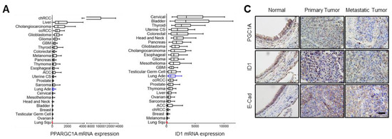 PPARGC1A (PGC1α) and ID1 mRNA expressions in 26 different types of cancers were obtained from the cBioPortal (www.cbioportal.org (accessed on 1 January 2020)) where mRNA data were offered in the form of normalized RSEM value. The number of patients are as follows: chRCC, kidney chromophobe (n = 66); liver, liver hepatocellular carcinoma (n = 366); cholangiocarcinoma (n = 36); ccRCC, kidney renal clear cell carcinoma (n = 469); glioblastoma (n = 154); glioma (n = 514); GBM, glioblastoma multiforme (n = 160); thyroid, thyroid carcinoma (n = 498); colorectal, colorectal adenocarcinoma (n = 382); melanoma, skin cutaneous melanoma (n = 443); pancreas, pancreatic adenocarcinoma (n = 177); Thymoma (n = 119); esophageal, esophageal cancer (n = 181); ACC, adrenocortical carcinoma (n = 78); uterine CS, uterine carcinosarcoma (n = 57); prostate, prostate adenocarcinoma (n = 493); sarcoma (n = 253); lung ade, lung adenocarcinoma (n = 230); cervical, cervical squamous carcinoma (n = 294); mesothelioma (n = 87); head and neck, head and neck squamous cell carcinoma (n = 279); bladder, bladder urothelial carcinoma (n = 129); breast, breast invasive carcinoma (n = 1100); testicular germ cell, testicular germ cell cancer (n = 156); ovarian, ovarian serous cystadenocarcinoma (n = 307); lung Squ, lung squamous cell carcinoma (n = 178). Publicly available microarray datasets (GSE85841, GSE7670, GSE102511, GSE19804, GSE19188, GSE14407, GSE66957, GSE26910, GSE108757) were downloaded from Gene Expression Omnibus (www.ncbi.nlm.nih.gov/geo (accessed on 1 January 2020) and analyzed to compare mRNA levels of PGC1α and ID1 between normal and cancer tissues. The 1569141_a_at probe or 219195_at probe (corresponding to PGC1α), and the 208937_s_at probe (corresponding to ID1) were used to determine the value of PGC1α and ID1, respectively. Lung tissues (n = 113) were grouped as three classes: Normal lung adjacent to cancers (n = 9), primary lung cancers (n = 94), and metastatic lung cancers (n = 10). For survival analysis, the median expression values of each protein from patient microarray results were used as criteria standard to distinguish the low expression and high expression groups. For correlation analysis, spearman’s correlation test was performed to analyze the relationship between paired genes. The R values indicate the existing linear correlation between two variables X and Y, giving a value between +1 and −1, where 1 is total positive correlation, 0 is no correlation, and −1 is total negative correlation. The p value represents the significance of this R coefficient.