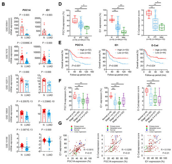 To investigate the role of the PGC1α-ID1 axis in human lung cancer on a large scale, we firstly examined PGC1α and ID1 mRNA expressions in 26 different major cancers using TCGA database. Consistently with our findings, PGC1α and ID1 is expressed at a low level in lung cancer (Figure 5A). In other types of cancers, such as breast and ovarian cancer, no change in the expression of PGC1α and ID1 was observed between normal tissues and cancer tissues (Figure S5A,B). We extended these findings to five additional datasets in which gene expression datasets for normal and LUAD are publicly available. A decrease in the expression of PGC1α and ID1 mRNAs in LUAD compared with normal tissues was observed in all datasets (Figure 5B). To evaluate the correlation between PGC1α, ID1, and E-cadherin expressions at the protein level, we performed IHC in human lung cancer tissue arrays. The patients’ clinical information is summarized in Table S2. We detected that the expression of PGC1α, ID1, and E-cadherin was progressively reduced from primary tumors to metastatic tissues (Figure 5C,D). When the lung cancer tissues were sub-divided into PGC1α_high and PGC1α_low groups using a median value of PGC1α, a lower overall survival rate was evident in the PGC1α_low compared with the PGC1α_high (Figure 5E). Similar results were observed regarding ID1 and E-cadherin (Figure 5E). However, the levels of PGC1α, ID1, and E-cadherin in lung cancers did not decrease significantly with the tumor stage (Figure 5F). PGC1α expression revealed a strong correlation with ID1 in lung cancer tissues. Furthermore, PGC1α and ID1 expression positively correlated with the expression of E-cadherin, the representative epithelial marker (Figure 5G). These results suggest that the expression of PGC1α and ID1 was downregulated in lung cancers, with an expression pattern reminiscent of a high metastatic potential and a poor clinical outcome.