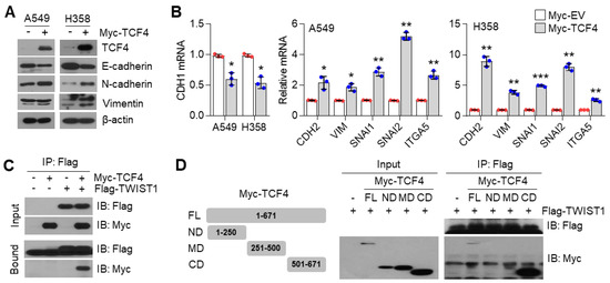 A549 lung cancer cells were seeded at 5 × 104 cells/well in 6-well tissue culture plates and incubated for 24 h to allow attachment and stabilization. Cells were transfected with either 10 nM siRNA targeting human TCF4 mRNA or control (Santa Cruz Biotechnology, Santa Cruz, CA, USA), respectively. For luciferase assay, HEK293T cells were seeded at 10,000 cells/well in 12-well plates, and cells were then transiently transfected with ID1, ID2, E-cadherin-WT, or E-cadherin-Mut-promoter luciferase vector (100 ng). For co-immunoprecipitation assay, HEK293T cells were seeded at 5 × 104 cells/well in 6-well plates, and cells were then transfected with Myc-tagged TCF4, Flag-tagged TWIST1, or ID1-expressing plasmids as following the experimental design. Transient transfection was performed using Polyfect transfection reagent (Qiagen, Hilden, Germany).