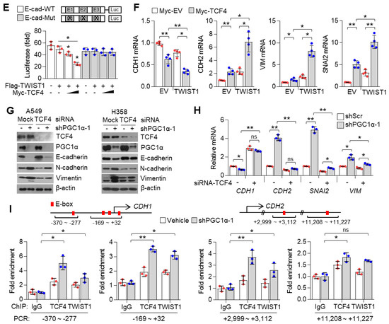 Promoter region of ID1 and ID2 were amplified using genomic DNA isolated from A549 lung cancer cells and PCR containing primers with Xho I and Hind III restriction site, and then amplified PCR fragments were inserted into the pGL3-basic vector. Primer sequences for PCR amplification were described in Table S3. E-cadherin-wild type (pXP2-E-cadherin-WT) and E-cadherin-mutant (pXP2-E-cadherin-Mut-E1/E2/E3) luciferase vector were kindly provided by Dr. Muh-Hwa Yang [33]. Each luciferase vector was transfected using a Polyfect (Qiagen, Hilden, Germany) into HEK293 cells with Flag-PGC1α, Flag-TWIST1, Myc-TCF4, or pcDNA-ID1 following the experimental aims, then transfected cells were stabilized for 24 h. Cell lysates were reacted with the luciferase assay buffer, and luciferase activity was measured by using Luminometer (BioTek, Winooski, VT, USA). The transfection efficiency was normalized by β-gal assay.