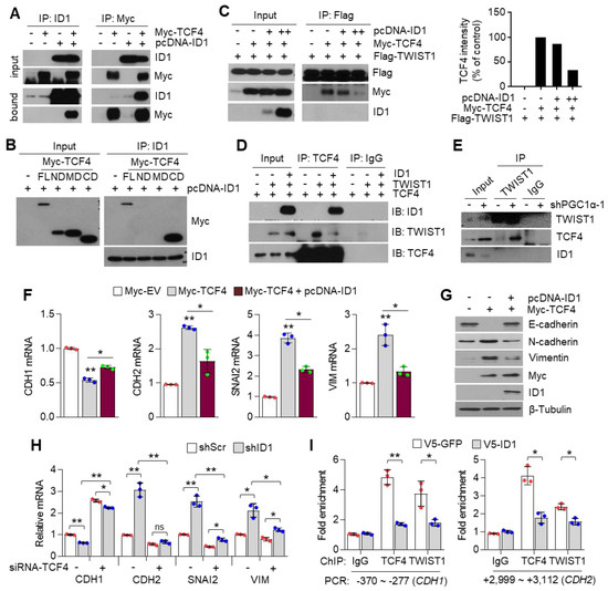 ID1 inhibits the interaction and transcriptional activity of TCF4 and TWIST1. (A) The protein–protein interaction of ID1 and TCF4. Interaction between TCF4 and ID1 was analyzed using co-immunoprecipitation and Western blotting. (B) ID1 interacts with the C-terminal region of TCF4. (C) Interaction between TCF4 and TWIST1 upon ectopic ID1 expression was analyzed by co-immunoprecipitation and Western blotting. The levels of TCF4 protein, which binds to TWIST1, was quantified by using image J. (D) In vitro protein–protein interaction analysis using recombinant proteins. Interaction between TCF4 and TWIST1 was measured by co-immunoprecipitation using anti-TCF4 or anti-IgG antibodies and Western blotting. (E) Endogenous TCF4 and TWIST1 interaction in PGC1α-silenced A549 cells. (F,G) Expression of the EMT genes (F) and proteins (G) in A549 cells expressing Myc-EV or Myc-TCF4 with or without pcDNA-ID1 as indicated (n = 3). (H) Expression of the EMT genes in A549 cells (n = 3). (I) ChIP for TCF4, TWIST1, and IgG followed by ChIP-qPCR in PGC1α knocked-down A549 cells transfected with GFP and ID1 (n = 3). (J) Graphical summary of the proposed molecular mechanism by which decreased PGC1α suppresses ID1, and consequently increases TCF4-TWIST1-mediated EMT. Conversely, high levels of PGC1α expression-induced ID1 result in suppression of EMT by interfering the interaction between TCF4-TWIST1. Black and red arrows represent the positive effect, ┴ line represents the negative effect, and X represents the suppressive effect on the proposed working model. Values represent mean ± SD. ns, not significant; * p < 0.05 and ** p < 0.01 by Student’s t-test. The whole western blot images are showed in Figure S7.