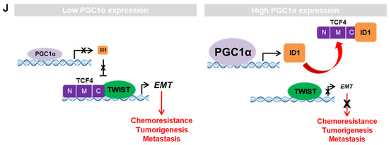 ID proteins function as dominant-negative regulators of bHLH transcription factors (such as E-proteins family), in this case, of TCF4, through the formation of non-functional heterodimers, and therefore block their DNA binding and transactivation of their target genes [57]. Various studies have revealed the association of E-proteins with their negative regulators (ID family) in the development of diseases such as Rett syndrome (TCF3, ID1-4), atherosclerosis (TCF3, ID3), Diamond Blackfan anemia (TCF12, ID2), polycystic kidney disease (TCF3, ID2), and Burkitt’s lymphoma (TCF3, ID3) [58,59,60,61,62]. Similarly, our study revealed that ID1 directly interacts with the c-terminal region of TCF4 and weakens the binding affinity of TCF4 to the target gene promoter, leading to the attenuation of the transcription activity of TCF4-regulated genes. As ID1 and TWIST1 share the binding domain of TCF4, PGC1α knock down-driven ID1 loss could not interfere with the TCF4-TWIST1 complex, and thus, induced EMT potential in the process of lung cancer metastasis.