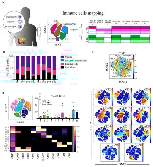 From the patients described above, 20 mL blood was collected immediately before surgery into sodium heparin tubes (BD). Tissue samples were placed in RPMI media (Gibco, Waltham, MA, USA) on ice and were reviewed by a designated histopathologist who provided a 10 mm by 10 mm by 3 mm piece for this study. Samples were digested, stained and run on CyTOF.