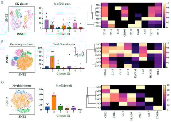 Peripheral blood from the same patients presented different population compositions (Figure S5). Specifically, we observed a small percentage (1.26 ± 1.37%) of low-density neutrophils in the PBMC samples (Figure S5A, metacluster 11,14) which have been described in PBMCs of patients with tumours [31]. Circulating NK cells, unlike the tumour-associated NK cells, appeared to retain their cytolytic activity with most sub-populations expressing CD56dim, CD57, GzmB and CD16 (Figure S5B). We also observed a significant population of circulating MDSCs (Figure S5A, metacluster 3, 27.82 ± 8.09%) and the presence of T-cell/monocyte conjugates (Figure S5A, metaclusters 2 and 13, 0.85 ± 0.42%) expressing PD-L1 (Figure S5C, metacluster 1) suggestive of an immune perturbation [32] (Figure S5C, metacluster 1).