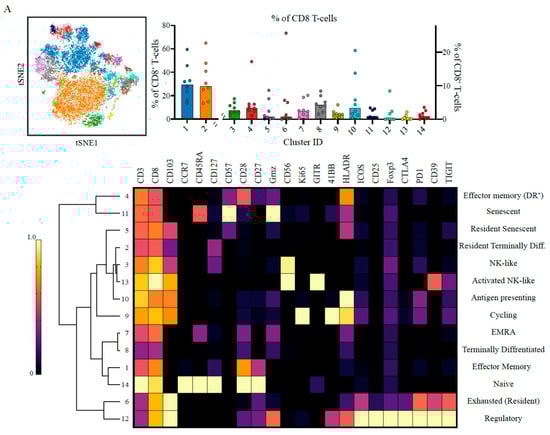 Dimensionality reduction visualisation with viSNE and clustering with FlowSOM were done using built in functions in cytobank (https://www.cytobank.org, accessed on 27 February 2021) The number of clusters and metaclusters for the FlowSOM algorithm were reviewed by the researchers. Data was initially overclusterd to identify small populations (all data shown in supplementary figures), but for clarity metaclusters were manually combined following researchers’ evaluation and presented in main figures. Heatmaps of normalized marker expression, relative marker expression, and relative difference of population frequency were generated by cytobank and plotted using Prism (GraphPad). Dendograms showing hierarchical clustering of the heatmaps was performed using Morpheus from the Broad Institute (https://www.broadinstitute.org/cancer/software/morpheus/, accessed on 27 February 2021), as an average with 1- Pearson correlation as a parameter.