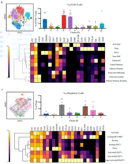 We next analysed the contribution from CD4+ T-cells as potential mediators to support CD8+ T-cells (Figure 2B, Figure S7). The 10 identified metaclusters were divided into three main groups: (i) senescent and terminally differentiated (metaclusters 6,8,4) or non-tumour responsive (metaclusters 2,5,9,10) (~76.15 ± 9.45%), (ii) exhausted (metacluster 7; 2.71 ± 2.03%) and (iii) Foxp3+ regulatory (~18.53 ± 8.78%). Indeed, the regulatory CD4+ cells comprised between 8.30 and 32.50% of the CD4+ population across patients.