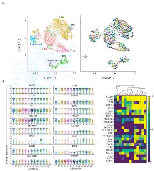 The CyTOF analysis highlighted senescent T-cells and TIGIT+ICOS+ Tregs as potentially important immune cells in pancreatic cancer. We hypothesised similar signatures should be identified on the transcriptional level. We have re-analysed a publicly available single-cell RNA sequencing dataset of 24 PDAC patients from Peng et al. [43] (Figure 3). Focusing on the T-cell compartment, we identified 250 unique clusters as shown in the UMAP (Figure S11A, Figure 3A) corresponding to CD8+ and CD4+ T-cells as well as non-conventional T-cells.