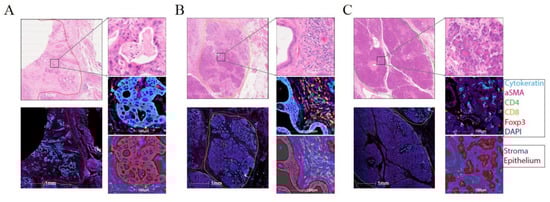 Six consecutive staining cycles were performed using the following 1ry Antibody-Opal fluorophore pairings: CD4 (clone 4B12, NCL-L-CD4-368 (Leica Novocastra, Linford Wood, Milton Keynes, UK)–Opal 520); CD8 (clone C8/144B, M7103 (DAKO Agilent, Santa Clara, CA, USA) -Opal 570); CD3 (clone LN10, NCL-L-CD3-565 (Leica Novocastra)–Opal 540); FOXP3 (clone 236A/E7, ab20034 (Abcam, Cambridge, UK)–Opal 620); Pan Cytokeratin (clone AE1/AE3, M3515 (DAKO Agilent)–Opal 650) and aSMA (rabbit polyclonal, ab5694 (Abcam) -Opal 690).