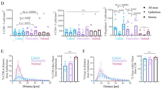 To investigate the potential cell–cell communication between different T-cell subsets and the surrounding malignant epithelium of the tumour, we analysed cellular spatial distribution using multiplex immunofluorescence (IF) on formalin-fixed paraffin-embedded (FFPE) sections from the same patients as analysed by CyTOF (Figure 4). For each case we identified cancerous, inflamed (pancreatitis) and normal tissue regions, where available (Figure 4A–C, respectively) and annotated the sub-regions into epithelium (based on pan-Cytokeratin staining) and stroma (based on SMA staining). Using the expression of the canonical T-cell markers (CD3+, CD4+, CD8+ and Foxp3+), we identified their respective cellular subsets (Figure S12). The CD4+ and CD8+ distribution within the different regions of the tissue (Figure 4D) was homogeneous with no signs of exclusion from the tumour parencyhma or different stroma regions (Figure S12). Conversely, Tregs were exclusively restricted to the stroma in the cancer and inflamed tissue and almost absent from the epithelium regions. Explaining some recent reports linking Treg depletion to fibroblast pathology in PDAC [23,46]. To further elucidate the relationships between the cells we performed proximity analysis (See methods for details) that revealed the majority of CD8+ T-cells to be within 50 mm of the epithelium, with a trend of lower numbers within the cancer region compared to normal albeit not statistically significant (Figure 4E, p = 0.1167). 90% of Tregs were in close proximity of a CD8+ T-cell, potentially facilitating their immunosuppressive activity across all assessed regions (Figure 4F).