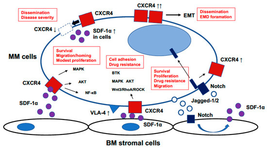 Epithelial–mesenchymal transition (EMT) plays a crucial role in both physiological conditions and pathological settings [94,95], as well as cancer progression and metastasis [96,97]. CXCR4 and SDF-1α have been reported to act as positive regulators of tumor cell metastasis in solid tumors [98,99]. Roccaro et al. demonstrated that CXCR4 enhanced the acquisition of an EMT-like phenotype in MM cells and induced higher bone metastasis and EMD dissemination in vivo [100]. EMD- and BM-prone MM cells were generated by in vivo selection approach. EMD-prone clone colonized BM niche and could be metastasized to and engraft within extramedullary sites, whereas extramedullary infiltration of the BM clone was not detectable. The transcriptional profile by RNA sequencing included genes defining an EMT, hypoxia-associated genes, and TNFα/NF-κB response-related genes. These findings indicated that EMT occurs not only in BM-disseminating MM cells but also in MM cells colonizing EMD sites. Additionally, both BM- and EMD-prone clones expressed higher surface CXCR4 compared with the parental cells. Moreover, the CXCR4 expression in the EMD-prone cells was relatively higher compared with the BM-prone cells. CXCR4 enhanced the acquisition of an EMT-like phenotype in MM cells with a phenotype conversion for invasion. Ulocuplumab, a monoclonal anti-CXCR4 antibody, suppressed MM cell dissemination, suggesting the inhibition of EMT-like phenotype conversion of MM cells by targeting CXCR4 [100]. These findings strongly suggest that SDF-1α and CXCR4 play a central role in MM disease progression and EMD development.