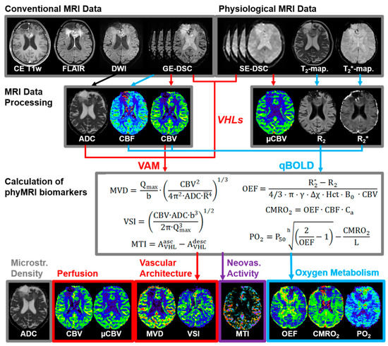 In summary, the data processing procedures resulted in two cMRI biomarker maps for microstructural density (ADC) and macrovascular perfusion (CBV) as well as six phyMRI biomarker maps for microvascular perfusion (µCBV), microvascular architecture (MVD and VSI), neovascularization activity (MTI), and oxygen metabolism (OEF, CMRO2, and PO2). All nine MRI biomarker maps are summarized at the bottom of Figure 1 (adapted from [42]). The time for processing the VAM (3.5 min) and qBOLD data (3.5 min) was seven minutes).