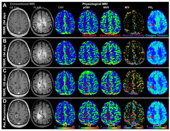 Follow-up MRI examinations of a 61-year-old male patient who developed recurrence of an anaplastic astrocytoma: (A) 294 days, (B) 194 days, and (C) 105 days, respectively, conventional anatomic MRI (CE T1w and FLAIR) and macrovascular perfusion (CBV) showed no indications for changes in the brain area where recurrence finally occurred. However, microvascular perfusion (µCBV), microvascular architecture (MVD), and neovascularization activity (MTI) revealed physiological changes (red circles) in the follow-up 105 days before radiological recurrence. Tissue oxygen tension (PO2), however, initially revealed a decrease from TBRR = 294 to 194 days (A,B), followed by a rebound till radiological recurrence. (D) Radiological recurrence was clearly detectable with conventional MRI and showed an increase in capillary perfusion and neovascularization activity. The patient received repeat combined radio-chemotherapy of the tumor. TBRR = time before radiological recurrence.