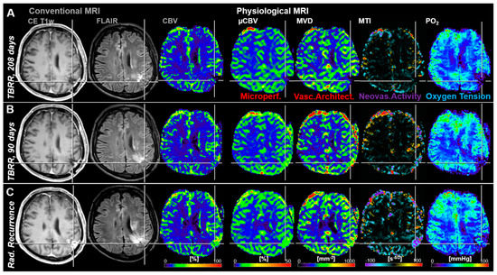 Follow-up MRI examinations of a 67-year-old male patient who developed local recurrence of an anaplastic astrocytoma (WHO Grade III). (A) The first follow-up examination (208 days before radiological recurrence) showed strong local hypoxia in the relevant region with low perfusion and microvascular architecture as well as without neovascularization activity. (B) In the second follow-up MRI examination, 118 days later and 90 days prior to radiological recurrence, a slight increase in microvascular perfusion, microvascular architecture, neovascularization activity, and local tissue oxygen tension was observed in this brain region. (C) This resulted in radiological recurrence detection of the AG another 90 days later. Repeat craniotomy revealed malignant transformation to glioblastoma. TBRR = time before radiological recurrence.