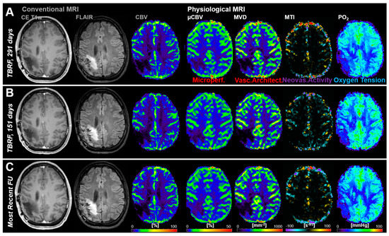 A total of 142 follow-up examinations of the 60 patients were evaluated in more detail. Calculation of the cMRI biomarker maps for microstructural density (ADC) and macrovascular perfusion (CBV) as well as the six phyMRI biomarker maps for microvascular perfusion (µCBV), microvascular architecture (MVD and VSI), neovascularization activity (MTI), and oxygen metabolism (OEF, CMRO2, and PO2) was successfully performed for all these follow-ups. The phyMRI biomarker maps provided indications for early changes in tissue physiology which occurred prior to tumor recurrence in patients with IDH-mutated AG.