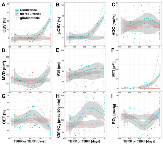 Time courses of the dynamic MRI biomarker changes that occurred prior to recurrence of an AG (cyan) or during a one-year-period without signs of recurrence (red), respectively. Scatter plots and locally-estimated-scatterplot-smoothing (LOESS) trend lines of MRI biomarker for (A) macrovascular perfusion (CBV), (B) microvascular perfusion (µCBV), (C) microstructural density (ADC), microvascular architecture represented by (D) microvessel density (MVD) and (E) diameter (VSI), (F) neovascularization activity (MTI), and oxygen metabolism (G: OEF; H: CMRO2, and I: PO2) versus time before radiological recurrence (TBRR, in days) in case of recurrence or versus time before most recent follow-up examination (TBRF, in days) in case of stable disease (no recurrence). The dashed lines, which are included for comparison purposes, represent the corresponding time courses for isocitrate-dehydrogenase (IDH)-wild type glioblastoma from a previous study [42].