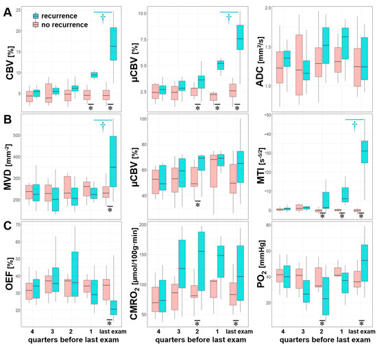 Series of box and whisker plots of quarterly pooled MRI biomarker of (A) perfusion (CBV and µCBV) and microstructural density (ADC), (B) microvascular architecture (MVD and VSI) and neovascularization activity (MTI), and (C) oxygen metabolism (OEF, CMRO2, and PO2) for AG recurrence (cyan) and stable disease (no recurrence, red), respectively. Crosses (†) mark significant differences between two successive quarters within the same patient subgroup, and asterisks (*) mark significant differences between patient subgroups within the same quarter (p < 0.05).
