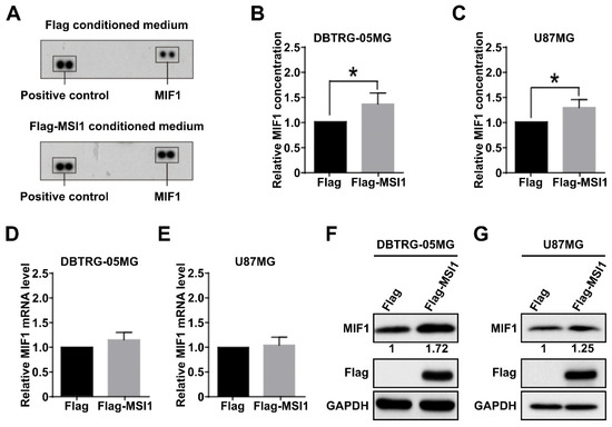 Musashi-1 overexpression in GBM cells elevates MIF1 expression and secretion. (A) Cytokine array analysis showing the level of MIF1 in the medium conditioned by the DBTRG-05MG cells overexpressing Flag–MSI1 (bottom panel). The top panel shows results from the cells transfected with a control Flag-only plasmid. (B,C) ELISA analysis showing the levels of MIF1 in the medium conditioned by the DBTRG-05MG (B) or U87MG (C) cells overexpressing Flag–MSI1. Mean values relative to the Flag-only control are shown, n = 3, SD—error bars, * p < 0.05 (Student’s t-test). (D,E) Quantitative RT-PCR analysis showing the expression of MIF1 mRNA in the DBTRG-05MG (D) or U87MG € cells overexpressing Flag–MSI1. Mean values relative to the Flag-only control are shown, n = 3, SD—error bars. (F,G) Western blotting showing the protein level of MIF1 in the DBTRG-05MG (F) or U87MG (G) cells overexpressing Flag–MSI1. Numbers under the top panel show densitometry quantification of MIF1 bands. GAPDH was used as a loading control.