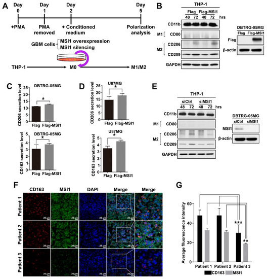 In the tumor microenvironment, macrophage polarization leads to two distinct phenotypes, M1 and M2, with the M2 phenotype promoting tumor growth. Therefore, we established a macrophage polarization model using GBM cell lines and THP-1 monocyte cells. In this model, human THP-1 monocytes were first differentiated into M0 macrophages by incubation with phorbol 12-myristate 13-acetate (PMA) until the CD11b marker was upregulated (Figure 2A, Supplementary Figure S2A). The THP-1-derived M0 macrophages were then treated with conditioned media generated from the DBTRG-05MG cells overexpressing exogenous MSI1 or with silenced endogenous MSI1, and the M1/M2 polarization status was then analyzed after allowing differentiation to take place for three days (Figure 2A). The completion of M1 or M2 polarization was validated by examining the expression of CD80 or CD163, CD206, CD209 markers, respectively. Indeed, the control M1 and M2 macrophages induced in parallel to polarize to their respective states by standard protocols exhibited proper expression of their respective markers (Supplementary Figure S2B,C). After incubation with the conditioned medium from the MSI1-overexpressing DBTRG-05MG cells, THP-1 monocytes were preferentially differentiated into M2 macrophages, as the CD80 protein expression was barely detected, while CD206 and CD209 were largely increased when compared to the cells treated with the medium conditioned by the DBTRG-05MG cells transfected with the Flag-only control plasmid (Figure 2B). Similarly, the endogenous expression of CD206 was also increased in macrophages induced by MSI1-overexpressing U87MG-conditioned medium (Supplementary Figure S2D). The ELISA analysis of cytokines released into the culture medium also showed significantly increased CD206 and CD163 secretion by macrophages induced to polarize by the media conditioned by the MSI1-overexpressing DBTRG-05MG (Figure 2C) and U87MG (Figure 2D) cells. In contrast, silencing of endogenous MSI1 by siRNA led to lowered expression of CD206 when compared to that of siRNA control in DBTRG-05MG cells (Figure 2E). Interestingly, the immunofluorescence analysis of the expression of CD163 and MSI1 in three clinical GBM specimens revealed that the higher expression of the former was associated with the higher expression of the latter indicative of possible correlation in vivo (Figure 2F,G). In conclusion, we show that MSI1 expression in GBM cells results in secretion of the factor/factors that cause polarization of macrophages to the M2 type.