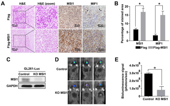 To further investigate the interplay between MSI1 and MIF1 in vivo, we established a mouse GBM xenograft model [37]. For this purpose, the MSI1-overexpressing DBTRG-05MG cells were intracranially xenografted into immunocompromised mice and the expression of MIF1 and MSI1 was interrogated by immunostaining. Our data demonstrated that the level of MIF1 was indeed significantly elevated in the tumor tissues derived from the MSI1-overexpressing DBTRG-05MG cells (Figure 3A,B). The in vivo consequences of MSI1-mediated MIF1 enrichment were further substantiated by utilizing GL261-Luc, another frequently used syngeneic murine GBM model that expresses luciferase to facilitate visualization of tumor growth and responses to treatments via bioluminescence imaging [38]. At first, we used the CRISPR/Cas9 technology to knock out the MSI1 gene in the GL261-Luc cell line (Figure 3C). As a result, it was shown that MSI1 knockout led to significantly smaller intracranial tumors in this syngeneic mouse model (Figure 3D,E). To summarize, we confirm that MSI1 overexpression leads to MIF1 upregulation in vivo and that such interplay between these two factors may result in enhanced tumor growth in an in vivo mouse model.