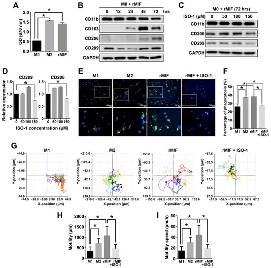 MIF1 antagonist ISO-1 is effective in reducing the M2 subpopulation and cellular proliferation, migration and phagocytosis. (A) MTT proliferation assay showing the effect of rMIF on proliferation of the rMIF-induced M0 phagocytes as compared to the M1 and M2 phagocytes derived by standard protocols. Mean values are shown, n = 3, SD—error bars, * p < 0.05 (Student’s t-test). (B) Western blotting showing the expression of the indicated macrophage markers in the time course of treatment of M0 macrophages with 100 ng/mL rMIF. GAPDH—loading control. (C) Western blotting analysis of the expression of the indicated markers in the cells derived by treatment of M0 macrophages with rMIF for 72 h in the absence (0 μM) or presence of ISO-1 at the indicated concentrations. (D) Densitometry quantification of the expression of CD209 and CD206 shown by Western blotting in (C). Mean values relative to 0 μM ISO-1 are shown, n = 3, SD—error bars, * p < 0.05. (E) Fluorescence microscopy images showing phagocytotic cells (green fluorescence) among the indicated macrophages. The bottom panel shows a zoomed view of the areas marked by rectangles in the top panel. Nuclei stained with DAPI (blue fluorescence). (F) Quantitative analysis showing the percentage of phagocytotic macrophages among the total number of macrophages. Means with SD error bars are shown, n = 3, * p < 0.05 (Student’s t-test). (G) Single-cell tracking by time-lapse microscopy of the indicated groups of macrophages. (H,I) Quantification of motility (H) and motility speed (I) of the indicated macrophages measured by time-lapse microscopy in (G). Mean values with SD error bars are shown, n = 3, * p < 0.05 (Student’s t-test).
