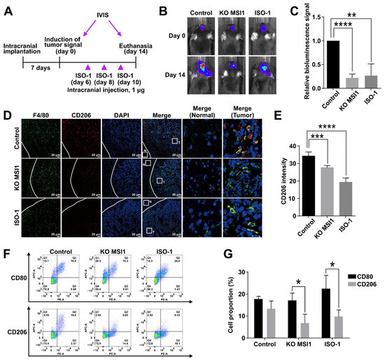 After confirming the antioncogenic effects of MIF1 inhibition in vitro, we applied a GL261-Luc syngeneic mouse model to test the effects of the ISO-1 inhibitor in vivo. For this purpose, immunocompromised mice were implanted with wildtype GL261-Luc cells in parallel with the cells subjected to the knockout of the MSI1 gene. After the initial tumor growth, the initial IVIS bioluminescence recordings of the GL261-derived intracranial tumors were made, and within the next two weeks, three administrations of ISO-1 were performed to a batch of mice intracranially transplanted with the wildtype GL261-Luc cells (Figure 5A). As was observed by bioluminescence recording after two weeks, the ISO-1-treated mice demonstrated noticeably stunted tumor growth compared to the untreated control mice (Figure 5B,C). The scale of this intracranial tumor growth reduction was the same as demonstrated by tumors derived from MSI1 knockout GL261-Luc cells (Figure 5B,C). Remarkably, as was shown by immunofluorescence staining, CD206 marker was severely reduced by both MSI1 knockout and ISO-1 administration, indicating reduction of the M2 macrophage population (Figure 5D,E). Further analysis by flow cytometry showed that while the CD80-expressing M1 macrophage population was not affected by either ISO-1 treatment or MSI1 knockdown, the CD206-expressing M2 population was markedly reduced (Figure 5F,G). To conclude, we show that inhibition of MIF1 by ISO-1 reduces GBM growth in vivo with concomitant reduction of the M2 macrophage population in a manner similar to that caused by the knockout of MSI1.