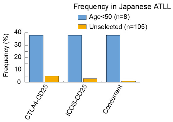 In a recent study, we reported on the analysis of genomic alterations in young Japanese ATLL cases [22]. In several types of cancers, young age is associated with unique genomic alterations which result in the development of tumors [40,48,49]. Since fusion proteins induced by structural variations are thought to be involved in carcinogenesis, compared with mutations alone, we screened for genomic fusions and genomic mutations by RNA-sequencing and targeted-sequencing. As a result, both CTLA4–CD28 and ICOS–CD28 fusions were found in 38% of the cases analyzed. Although these fusion genes were previously reported by Kataoka et al. (2015) [20] the frequency of young cases in our study was higher (Figure 1).