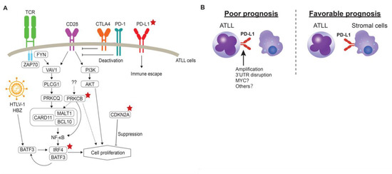 (A) Prognostic genomic alterations identified in ATLL. Red stars denote alterations related to prognosis in ATLL. (B) Difference of PD-L1 expression patterns on ATLL prognosis. Left: PD-L1 can be expressed through genomic alterations, including the amplification and 3’UTR disruption of PD-L1 on the surface of ATLL cells. Right: stromal cells in the tumor-microenvironment express PD-L1 and the cases are associated with favorable prognosis.