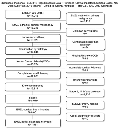 - Surveillance, Epidemiology, and End Results (SEER) Program. SEER*Stat Database: Incidence—SEER 18 Regs Research Data + Hurricane Katrina Impacted Lousiana Cases, Nov 2018 Sub (1975–2016 Varying)—Linked to County Attributes—Total U.S., 1969–2017 Counties, National Cancer Institute, DCCPS, Surveillance Research Program, Released April 2019, Based on November 2018 Submission. Available online: www.seer.cancer.gov (accessed on 2 November 2020).