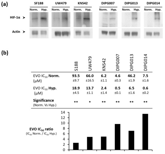 Hypoxic pediatric high-grade glioma (pHGG) and diffuse intrinsic pontine glioma (DIPG) cells are more sensitive to Evofosfamide (Evo) compared to normoxic ones. (a) Hypoxia inducible factor-1α (HIF-1α) expression level assessed by Western blot in pHGG and DIPG cell lines incubated for 72 h under hypoxia 1% O2 (Hyp.) compared to normoxia (Norm.). (b) Determination of Evo IC50 (inhibitory concentration 50) value after 72 h of treatment in pHGG and DIPG cell lines. IC50 are compared for each cell line between the normoxic condition (Norm.) and hypoxic condition 1% O2 (Hyp.) to calculate an Evo IC50 ratio. Values are the means of three independent experiments +/− SD. ** p < 0.001; * p < 0.05.