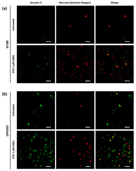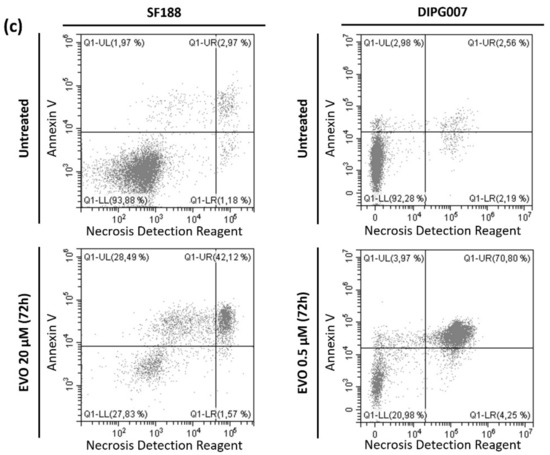We then wondered whether Evo triggered cell death or not under hypoxia. We chose to focus on the most widely used cell line of each category, namely SF188 for pHGG and DIPG007 for DIPG, both treated with the unique dose of 1 µM Evo, which is close to the DIPG007 Evo IC50. Apoptosis/necrosis staining analyzed by microscopy revealed that, after 48 h of treatment with 1 µM Evo under hypoxia 1% O2, most of the SF188 pHGG cells were positive for both stains, which is indicative of a late-stage apoptosis or of necrosis (Figure 2a). As a control, untreated cells mostly did not show any significant staining. The same kind of results was observed in DIPG007 treated cells under hypoxia, with the additional presence of a subpopulation of annexin V-positive only cells (Figure 2b). Thus, in both tested cell lines, Evo induced early- and/or late-stage apoptosis at 48 h of treatment. Under IC50 conditions, i.e., 20 µM Evo for SF188 and 0.5 µM for DIPG007 during 72 h under 1% O2 hypoxia, flow cytometry analysis revealed a predominance of late-apoptotic and/or necrotic cells, with 42.1% and 70.8% of Annexin Vpos/ NDRpos cells in the SF188 and DIPG007 cells, respectively.
