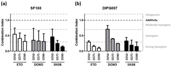 Subsequently, we tested the combination of Evo with three cytotoxic drugs widely used in pediatric oncology, frequently associated with an alkylating agent and belonging to different classes of antitumor drugs: doxorubicin (DNA intercalating agent and topoisomerase II inhibitor), etoposide (topoisomerase II inhibitor), and SN38 (topoisomerase I inhibitor). For each combination performed in both SF188 and DIPG007 cell lines, Chou and Talalay’s method revealed a significant synergistic effect, with CI mean values between 0.08 and 0.7, regardless of the dose effect (ED) considered (Figure 3). Interestingly, Evo exhibited a powerful synergy with both Etoposide and SN38 in DIPG007 cells.