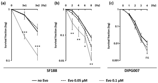 In SF188 cell line, 0.05 µM Evo did not significantly alter the survival fraction of irradiated cells. However, we demonstrated a significant difference in the survival fraction between untreated cells and cells treated with 0.1 µM Evo. We showed that 0.1 µM Evo treatment has a radiosensitizing effect in hypoxic SF188 cells exposed to a fractionated (3 × 1 Gy and 3 × 2 Gy) irradiation schedule (Figure 4a), as well as exposed to a 2–8 Gy single-dose irradiation schedule (Figure 4b). In contrast, even if Evo seemed to slightly sensitize the DIPG007 cells to ionizing radiations, no statistically significant difference was observed between 0, 0.05, and 0.1 µM Evo survival curves following a single-dose irradiation schedule (Figure 4c). Interestingly, DIPG007 cells did not support the 3 × 1 and 3 × 2 Gy fractionated irradiation schedule (no colony formed) and the survival fraction was already reduced by almost 90% with a single dose of 2 Gy, indicating a high sensitivity to ionizing radiations in vitro.